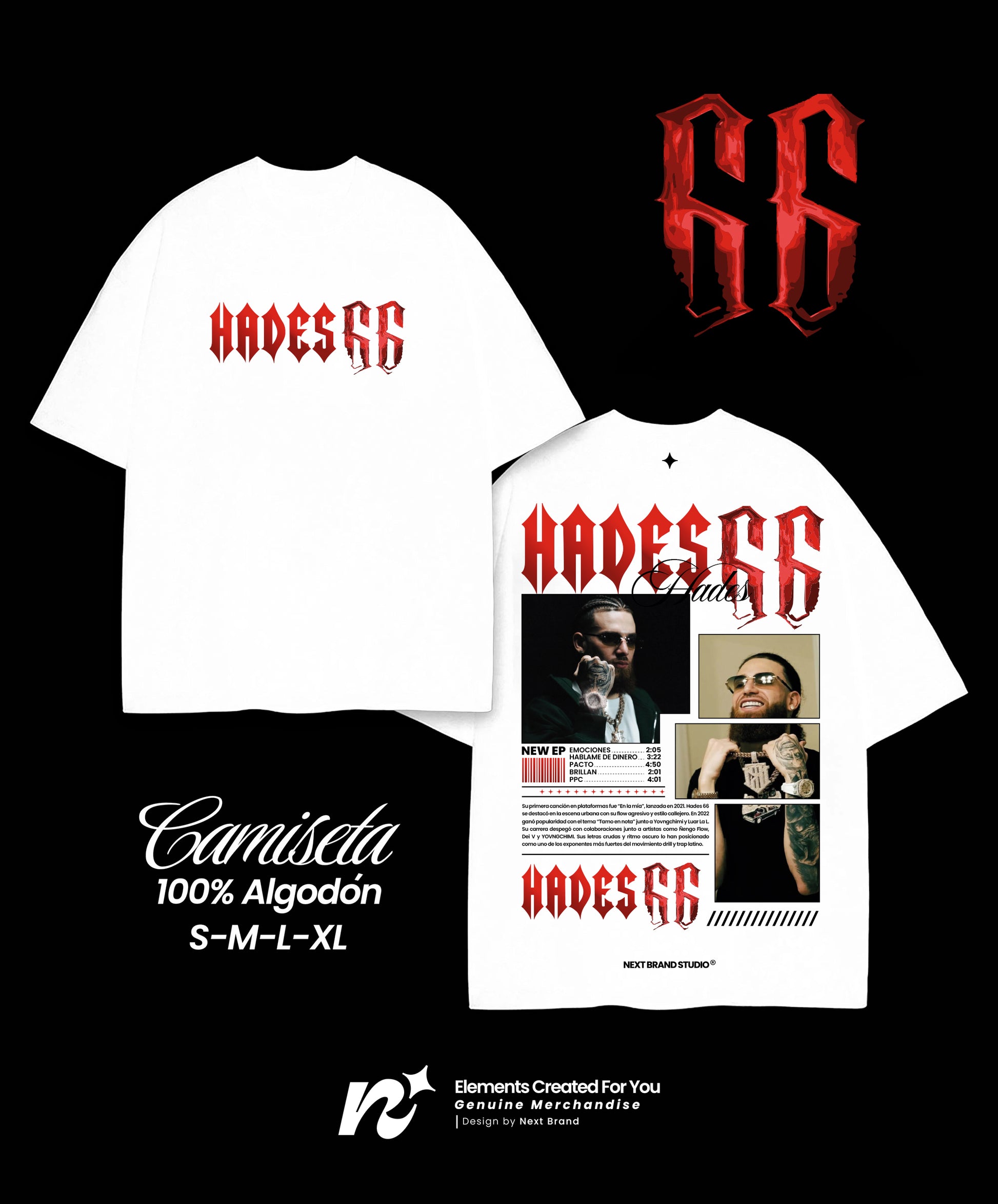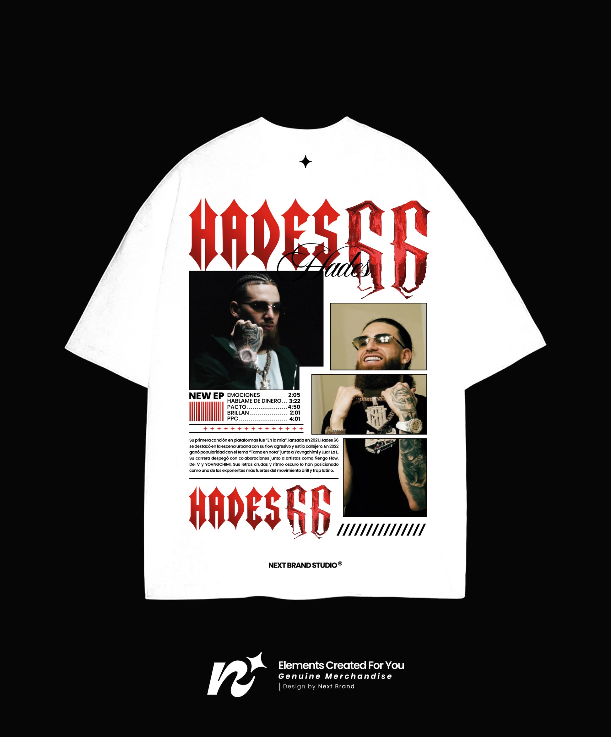 Vive la intensidad del trap con esta exclusiva camiseta de Hades66. Diseñada por Next Brand Studio, esta prenda captura la esencia rebelde y auténtica del rey del trap puertorriqueño.